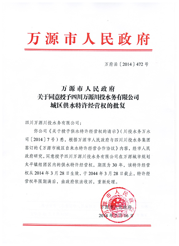 萬源水司特許經(jīng)營(yíng)權(quán)