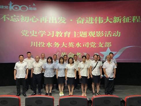 為深入開展黨史學(xué)習(xí)教育,慶祝中國(guó)共產(chǎn)黨成立100周年,進(jìn)一步在企業(yè)中興起觀看紅色影片、更加愛黨愛國(guó)的持續(xù)熱潮。根據(jù)川投水務(wù)集團(tuán)黨史學(xué)習(xí)教育領(lǐng)導(dǎo)小組通知要求和公司黨支部七月主題黨日活動(dòng)計(jì)劃。7月28日下午,大英水司黨支部組織全體黨員、預(yù)備黨員、入黨積極分子,在大英永逸電影院5號(hào)廳觀看紅色電影《革命者》。進(jìn)一步引導(dǎo)黨員干部群眾發(fā)揚(yáng)紅色傳統(tǒng),傳承紅色基因,賡續(xù)紅色血脈。