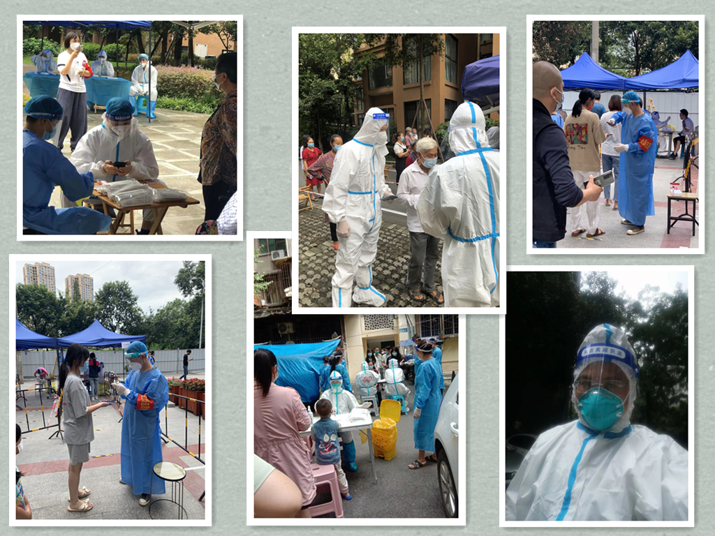 “各司其職、定格堅(jiān)守”“請(qǐng)有序排隊(duì)、老年人請(qǐng)這邊先做”“大爺、大媽,我來幫您掃碼”“來小朋友,嘴巴張大,啊!”“大白”“小藍(lán)”志愿者們各司其職,引導(dǎo)著居民們排隊(duì)掃碼核酸采樣,醫(yī)護(hù)人員們也有條不紊地為居民進(jìn)行核酸采樣?!耙还芄懿蓸釉噭⒁坏蔚纹D辛汗水、一條條臉龐勒痕”他們沒有喊苦喊累,依然用心用情地為居民們服務(wù)。
