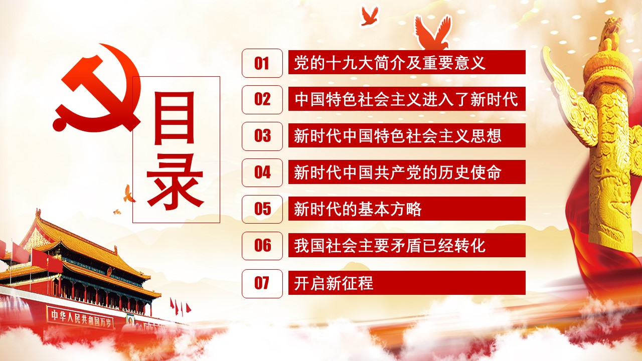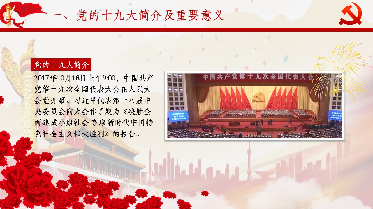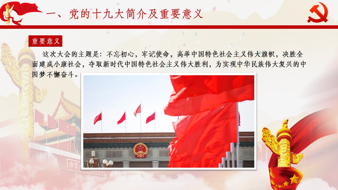 中國共產黨人的初心和使命,就是為中國人民謀幸福,為中華民族謀復興。中國共產黨第十九次全國代表大會,是在全面建成小康社會決勝階段、中國特色社會主義進入新時代的關鍵時期召開的一次十分重要的大會。大會的主題是:不忘初心,牢記使命,高舉中國特色社會主義偉大旗幟,決勝全面建成小康社會,奪取新時代中國特色社會主義偉大勝利,為實現(xiàn)中華民族偉大復興的中國夢不懈奮斗。習近平強調,不忘初心,方得始終。中國共產黨...